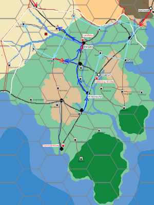 I started by creating a new map of the entire western theater of the war. The new map was at a large enough scale that individual villages and orc strongholds disappeared: all that mattered were counties and orc fortresses. Then I plotted out some movement for the orcs: about 2000 orcs in the northern half of the country moved to northern citadel of Landzby, while 3500 orcs in the south moved into the fortress of Rundbord. I generated commanders for the orcs - the northern orcs under Colonel Rolg were cursed with a Megalomaniac Lazy Bully with so-so strategic skills, while the southern orcs under Colonel Prulo had a mostly sane and defensive minded commander. The northern orcs had access to better roads and learned about the PCs' takeover of the capitol first, so even though their commander was lazy, they assembled first and were ready to move out on June 1st; the southern orcs weren't assembled until the 7th and didn't move out until the 11th.