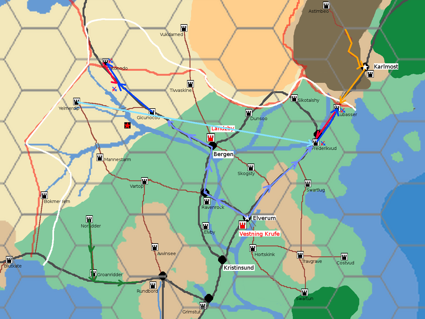 Army movement for Session 19: PC army in blue, flying boat movement in light blue, orc army movement in red.